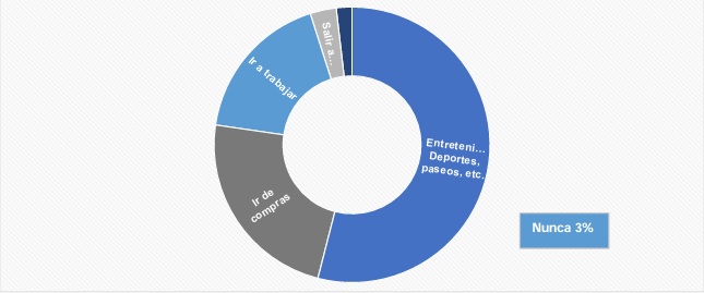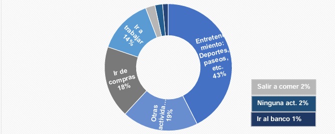 Por otra parte, se observa que las principales actividades que motivan a los peatones a caminar están relacionadas con razones específicas para visitar el área de estudio. Por ejemplo, el 43 % de los encuestados mencionó que camina principalmente para acceder a lugares de entretenimiento o paseos y el 18 % para ir de compras (Figura 2).