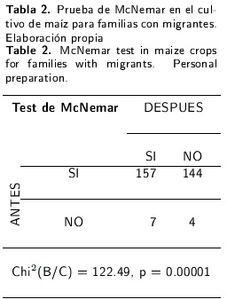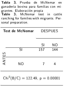 Con respecto a los elementos tecnológicos utilizados para la ganadería bovina de doble propósito en familias con migrantes, no hubo cambios para los siguientes: vacuna contra derriengue, vacunación doble, vacuna contra brucelosis, desparasitación interna, control de garrapatas, análisis de excremento, prueba de mastitis, prueba de brucelosis y tuberculosis, tratamiento de anestro, selección de desechos, barbecho y rastreo, siembra de pasto, control de malezas, rotación de potreros, ensilado, inventario y producción de leche. En contraste, se observó que hubo cambios positivos de acuerdo con la distribución Chi2 en la prueba de McNemar, para los siguientes elementos tecnológicos: inseminación artificial, monta controlada, diagnóstico de gestación, amamantamiento restringido, suplementación con forraje de corte, suplementación con subproductos agroindustriales, suplementación con concentrados comerciales y fertilización de pasto. Sólo se encontró un elemento tecnológico con cambios negativos (uso de suplementación con sales minerales).