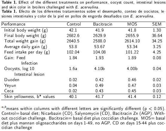 Eimeria spp infection, commonly known as coccidiosis, corresponds to a generalized problem in the poultry commercial industry, since it is impossible to maintain growing broilers without infection from these protozoans (McDougald 2003). Epidemiological studies in commercial broiler operations have shown that a peak in the number of coccidial oocysts in feces or litter occurs at 4 to 5 wk of age (McDougald and Reid 1991). Commercial anticoccidials usually contain antibiotics. As this has become a concern for consumers because of the potential development of antibiotic resistance, poultry growers are looking for alternatives to replace antibiotic-based anticoccidials (Jones and Ricke 2005). The loss of activity of some anticoccidial drugs and the need for alternative control programs for broilers have led to the study of new nutritional strategies. In addition, development of a rapid immune response is a key element in maximizing broiler growth performance (Kocher 2004). In countries like Mexico, where skin pigmentation has market value, coccidian infection has an especially large negative impact on this characteristic. Nutrient immunomodulation, feed additives and maintenance of normal gut flora in broilers are important considerations to obtain better responses than using an anticoccidial drug, and also make it possible to minimize the deleterious effects of coccidiosis (Dalloul and Lillehoj 2005). Similarly to antibiotics added to the diet, mannans have the ability to alter the microbial population in the intestinal tract. This modification seems to be accomplished by the ability of mannans to attach to mannose-binding proteins on the surface of cells of some strains of bacteria, preventing them from colonizing the intestinal tract by interfering in the binding of carbohydrate residues of epithelial cell surfaces (Steen and Nielsen 2000, Qureshi et al. 2000). The purpose of this study was to compare the effect of a growth promoter bacitracin Zn and a mannan oligosaccharide (Saccharomyces cerevisiae) on the performance, oocyst count, intestinal lesions and skin pigmentation of broilers challenged with an Eimeria acervulina infection.