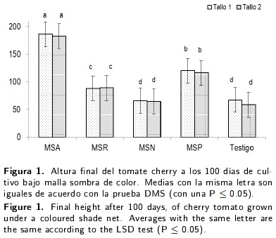 El uso de mallas sombra en la horticultura protegida es una técnica económica empleada para mejorar la radiación y evitar incrementos de temperatura. En la presente investigación se evaluó el efecto del uso de mallas sombra de cuatro colores (azul, negra, roja y perla) en la producción de tomate cherry. El rendimiento en la malla sombra de color perla se incrementó 116.66 % en comparación al rendimiento obtenido bajo la malla sombra de color negro y 122.85 % en comparación con el rendimiento obtenido en el testigo (sin malla). De acuerdo a los resultados de este estudio, la malla sombra perla se considera una alternativa viable para la producción de tomate cherry.
