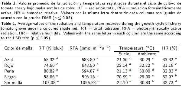 La RT en el macrotúnel con MSN, MSA, MSR y MSP, respecto al testigo, registró una disminución de 45.03, 36.20, 30.33 y 24.53 %, respectivamente, mientras que la RFA presentó una reducción con respecto al testigo de 44.71, 43.66, 43.54 y 38.58 % de transmisión los macrotúneles con MSA, MSP, MSN y MSR (Tabla 1). Se sabe que del 100 % de la RT incidente, sólo del 65 al 70 % penetra al interior de la estructura protegida (Samaniego-Cruz et al. 2002). Con respecto a la RFA, Cerny et al. (1999) y Samaniego-Cruz et al. (2002), reportaron reducciones de entre el 25 y 35 %. Lo anterior coincide con los resultados obtenidos por Retamales et al. (2008), quienes encontraron que la RFA transmitida por mallas de color blanco, gris, con 35 y 50 % de sombra, y rojo, con 35 % de sombra, redujeron la RFA en 29 %, mientras que las mallas de color rojo, con 50 % de sombra, y negro, con 35 y 50 % de sombra, disminuyeron la RFA en 41, 47 y 53 %, respectivamente, con respecto a la RFA del tratamiento sin malla. Los resultados obtenidos en la presente investigación denotan que las mallas de color transmitieron diferentes cantidades de RT debido al número de hilos (3x6 hilos por pulgada cuadrada) para lograr el efecto de sombreo, las cuales filtran selectivamente una mayor fracción de la radiación solar que pasa a través de los hilos plásticos (Shahak et al. 2008). En tanto que con la MSN, el tejido de la malla plástica sólo permite la entrada de la radiación por los orificios de la malla, la cual no es filtrada selectivamente (Tinyane et al. 2013).