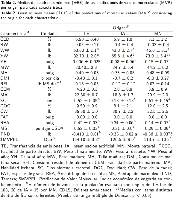 En conclusión, con base en los valores de cría genómicos predichos, en la población de bovinos Angus evaluada en Chihuahua, México, se mostró tener potencial genético para seleccionar y utilizar reproductores mejorados. En promedio, el potencial genético de los embriones de bovinos Angus importados en años recientes a Chihuahua, México, fue mayor en comparación al de los animales concebidos mediante IA y MN, pero ello requiere una selección cuidadosa de los progenitores con base a evaluaciones genéticas precisas para las características de importancia económica.