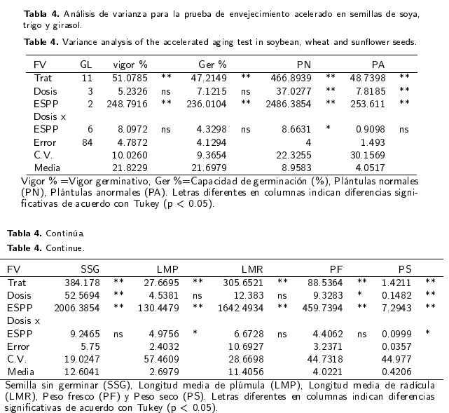 Prueba de envejecimiento acelerado (PEA). Se obtuvieron lotes de 200 semillas que fueron irradiadas de la misma forma que en la PGE, a las que se les indujeron condiciones de estrés con alta temperatura y humedad que aumentaron el deterioro fisiológico de la semilla (Moreno 1996, ISTA 1999). Se utilizó una cámara de envejecimiento 45 °C ±2 oC y 100 % de humedad relativa (HR). Dentro de la cámara se colocó un vaso de precipitado de 500 mi conteniendo 250 mi de agua, colocándose encima del nivel del agua las 200 semillas de cada tratamiento, en una malla plástica sostenidas por un soporte en el interior y cubiertas con una película plástica, la unidad experimental fue de cuatro vasos por tratamiento. El tiempo de exposición aplicado fue de 64 h para la soya y de 48 h para el trigo y el girasol (Moreno 1996). Al finalizar el periodo de exposición a las condiciones de alta temperatura y humedad, las semillas se dejaron enfriar a temperatura ambiente y se efectuó la PGE bajo un diseño completamente al azar. Para determinar el cambio porcentual observado entre las dos condiciones de PGE y PEA, se utilizó la siguiente fórmula:
