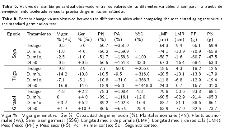 Al examinar el cambio porcentual observado entre los valores de las variables en la PGE y la PEA, se encontró un efecto positivo de la radiación UV-C en las variables de vigor y germinación en girasol y soya. En las variables PN, LMP, LMR, PF y PS el efecto de la PEA fue negativo en las tres especies. Sin embargo, la exposición al estrés en la PEA incrementó el número de PA y SSG.