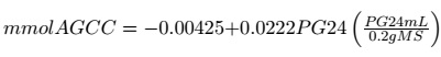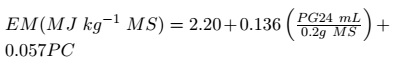 Donde: EM= energía metabolizable (MJ kg-1 MS), PG= gas producido en la hora 24. PC= proteína cruda. Para determinar el contenido de ácidos grasos de cadena corta (AGCC), se usó la fórmula de Getachew et al. (2002):