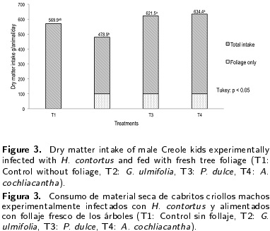 The higher dry matter intake and weight gain in animals of T3 and T4 (Figures 3 and 4) was attributed to the decrease in parasite load (H. contortus) (Figure 1) that prevented the development of gastritis caused by damage of the parasite to the mucosa of the digestive tract, which favored food digestion and nutrient absorption and increased dry matter intake caused by supplying 10 % (dry matter basis of the diet) Pithecellobium dulce and A. cochliacantha fresh foliage (Table 2), similar to that reported by Hoste et al. (2005). In vivo studies in small ruminants suggest at least 30 - 40 g of condensed tannins per kilogram of dry matter (DM) to observe anti-parasitical activity (Hoste et al. 2006). Waghorn (2008) and Patra and Saxena (2010) reported that tannins in low concentrations (3-6 %) show a positive effect on diet digestion and animal growth. Olivares et al. (2013a) observed that the use of P. dulce and G. sepium foliage increased dry matter intake and weight gain in male kids.
