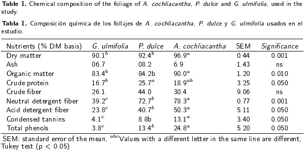 In the chemical composition of the three types of foliage used, it is observed that the dry and organic matter content was higher in A. cochilacantha foliage (p < 0.001) with 96.6 and 90.0 % respectively (Table 1). The crude protein content was higher in the P. dulce foliage (p < 0.05) with 25.7 %. The contents of neutral (p < 0.001) and acid (p < 0.01) detergent fibers, condensed tannins (p < 0.01) and total phenols (p < 0.01) were higher in the A. cochliacantha foliage with 78.3, 50.3, 13.1 and 24.8 %, respectively, compared to P. dulce and G. ulmifolia foliage (Table 1).