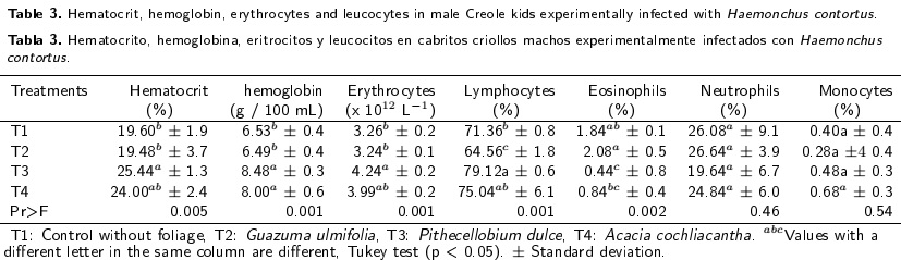 The secondary compound content of foliage of P. dulce and A. cochliacantha had higher activity for H. contortus control in kids, without affecting the health of the animals, and indirectly increased their dry matter intake and total weight gain. Animals under treatments T1 and T2 were the most parasitized, reducing the blood cell concentration and productive response in kids.
