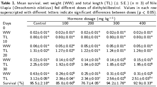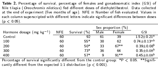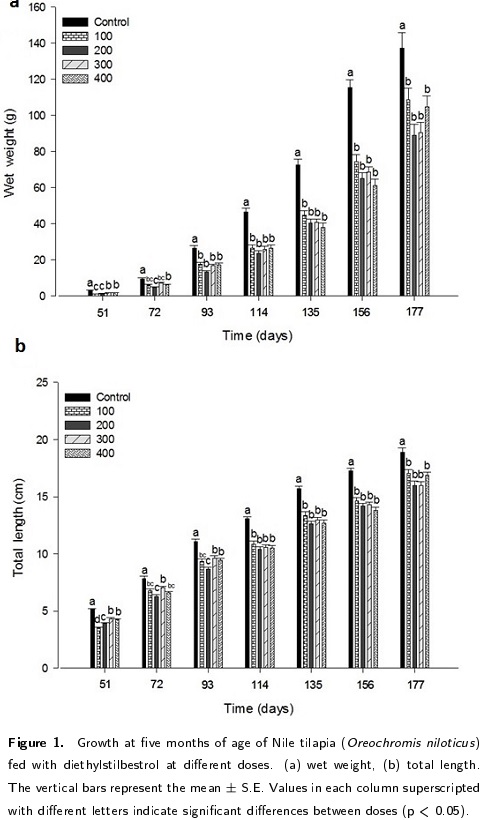 A decrease in growth has also been observed using DES in other freshwater species, such as the European catfish (Silurusglanis) (Krol et al. 2014). In this case, the negative effect on growth was not observed when the natural estrogen estradiol-17β was used. Similar results have been observed in our laboratory in early trials comparing estradiol-17β, 17α-ethinylestradiol and DES at the same concentrations. Currently, estradiol-17β is the estrogen that shows better growth and survival than the other two synthetic hormones but results in a lower feminization rate. The Nile tilapia is probably more susceptible to synthetic estrogens whose effect at the physiological level is more powerful.