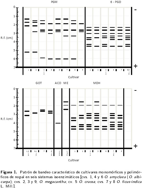 En nopal, el análisis de isoenzimas se utiliza para su clasificación taxonómica, a la vez que puede ampliar y complementar la descripción varietal de la especie. Además, las isoenzimas son marcadores ideales debido a que son colineales con el gen, por lo común codominante en efecto y poco afectadas por el ambiente. El fortalecimiento de la caracterización del nopal con herramientas alternativas, permite conocer de forma más eficiente la diversidad genética existente, apoyar su ubicación taxonómica, contribuir en programas de mejoramiento genético para la creación de nuevas variedades, así como enriquecer los bancos de germoplasma (Chessa et al. 1997), en este caso del nopal, el cual es reconocido por su importancia como recurso natural, pues colecciones de valor comercial o agronómico que se describen desde un punto de vista morfológico y antropocéntrico se protegen en bancos de germoplasma (Bellon et al. 2009). En este sentido, el objetivo del presente trabajo fue detectar polimorfismo en nueve cultivares de nopal caracterizados por producir brotes (nopalito) y frutas (tuna) de interés comercial de las especies O. amyclaea Ten. (O. albicarpa), O. megacantha, O. crassa y O. ficusindica (L.) Mili.