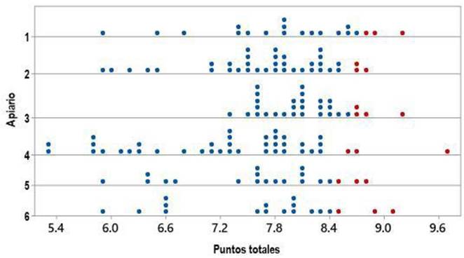 Figura 3 Puntos ponderado totales obtenidos por colonias por apiario. Colonias seleccionadas (•). Colonias no seleccionadas (•).