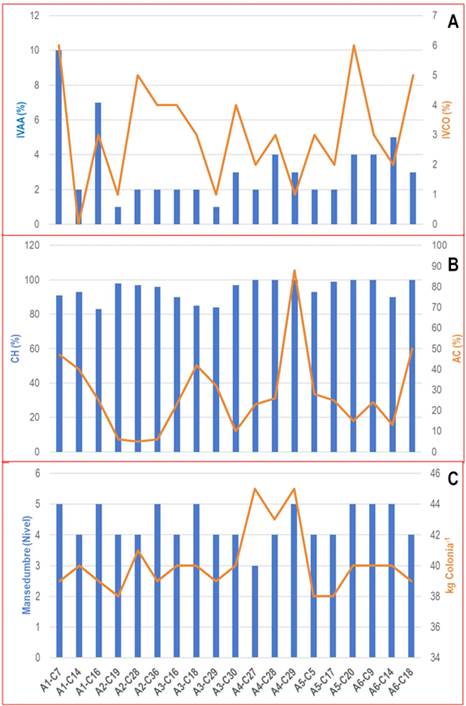 El promedio general de la IVAA fue de 4.73 ± 2.91%, con valor mínimo 0.03% y máximo 18.90%. La Figura 2A, muestra los promedios por apiario, los cuales presentaron diferencias estadísticamente significativas (p = 0.002). El mayor promedio de infestación se encontró en los apiarios 1 (6.76%) y 4 (5.76%). Los apiarios 2 (4.55%), 3 (3.85%), 5 (3.41%) y 6 (3.43%), siendo éstas últimas las colonias más sanas. 112 colonias, las cuales representan el 67.87% expresaron niveles de IVAA menor a 5%, 43 (26.06%) expresaron niveles de IVAA mayores al 5% pero menores a 10%, encontrando 10 colonias (6.06%) con niveles altos de IVAA mayores a 10%. Se encontró débil correlación positiva altamente significativa (r = 0.312, p = 0.000) de IVAA con IVCO. Respecto al CH, la correlación es muy débil negativa significativa (r = -0.199, p = 0.010). La correlación IVAA con M resultó muy débil negativa significativa (r = -0.177, p = 0.023).