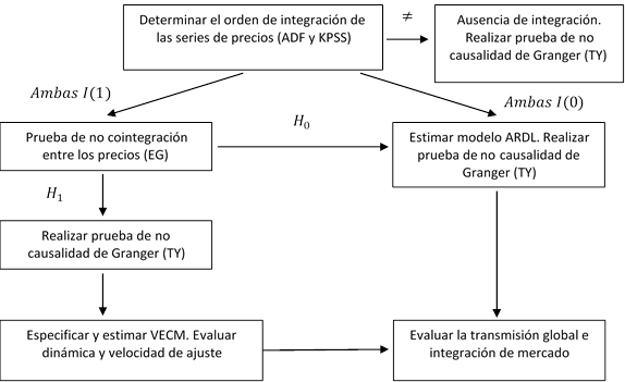 La metodología empleada descansa en el uso de pruebas de raíz unitaria y estacionariedad, de no cointegración y de no causalidad de Granger. Estas pruebas se aplicaron a los pares de precios: