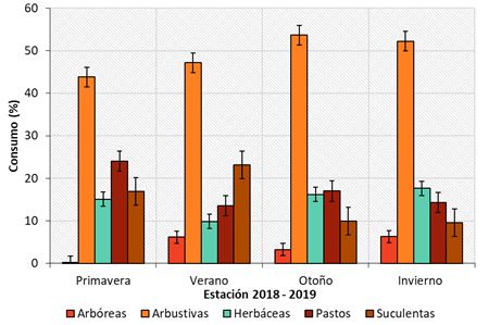La composición de la dieta fue principalmente de especies arbustivas (49.2 ± 4.57%) y pastos (17.2 ± 4.75%). Las suculentas representaron el 14.9 ± 6.48% y las herbáceas el 14.7 ± 3.37% de la ingesta anual. El ramoneo en árboles aportó el 4 ± 2.87% del consumo total de forraje. El consumo de especies arbustivas fue más alto durante otoño e invierno, representando más del 50% de la dieta durante ese período. Mientras que, los pastos fueron más frecuentes durante la primavera (24%), disminuyendo en verano (13.58%) y volviendo a aumentar en otoño (17%). Las especies suculentas, principalmente nopales del género Opuntia, fueron más consumidas durante el verano (23.2%). En contraste, las herbáceas y arbóreas fueron más comunes en la dieta invernal (17.61 y 6.31%, respectivamente) (Figura 2).