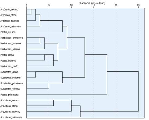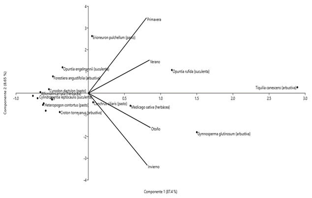 Se elaboró una matriz de frecuencias para cada especie de planta consumida, categorizándola según su forma biológica, estación del año y familia (Fracker y Brichle 1944). Posteriormente, se evaluó la diversidad estacional del forraje en función de la forma biológica de las especies consumidas mediante el índice de Shannon (1948). Asimismo, se estimó la correlación entre las especies consumidas, su forma biológica y su variación en el consumo por el borrego cimarrón de acuerdo con la estación del año. Para ello, se empleó un análisis de componentes principales (ACP), clasificando cada especie de planta consumida en todas las estaciones del año y su forma biológica. Las variables incluyeron las frecuencias estacionales de consumo de cada una de estas especies. El ACP implicó calcular la proporción individual y acumulada de cada componente principal, así como la correlación cofenética para evaluar el ajuste del modelo. La correlación cofenética varía de -1 a 1, donde 1 indica una alta correlación entre las variables del modelo, mientras que valores cercanos a -1 revelan una alta variación entre éstas, es decir, una baja o nula correlación. Para analizar la similitud en el consumo estacional de los distintos tipos de formas biológicas del forraje, se utilizó un análisis de cluster con el método de distancia Euclideana y se estimó la correlación cofenética usando los porcentajes de consumo mediante el software Infostat®. También se evaluó el índice de selectividad del forraje (ISF), el cual se expresó cuantitativamente como la relación entre la frecuencia de consumo de cada especie y su correspondiente disponibilidad en el hábitat (Guerrero-Cárdenas et al. 2016). Los valores obtenidos de este cociente se clasificaron cualitativamente de acuerdo con la metodología propuesta por Ramírez-Lozano (2012): especies con un ISF mayor a 2.5 fueron preferidas sobre otras disponibles; de 2.49 a 1.31, especies de mantenimiento; 1.3 a 0.7, indica un consumo neutro, es decir, que no existe diferencia entre la proporción consumida de la especie y su disponibilidad; por último, las especies evitadas con un ISF menor a 0.7. Adicionalmente, se aplicó la prueba U de Mann-Whitney (α ≤ 0.05) para identificar la relación entre el consumo y disponibilidad estacional del forraje en función de su forma biológica.