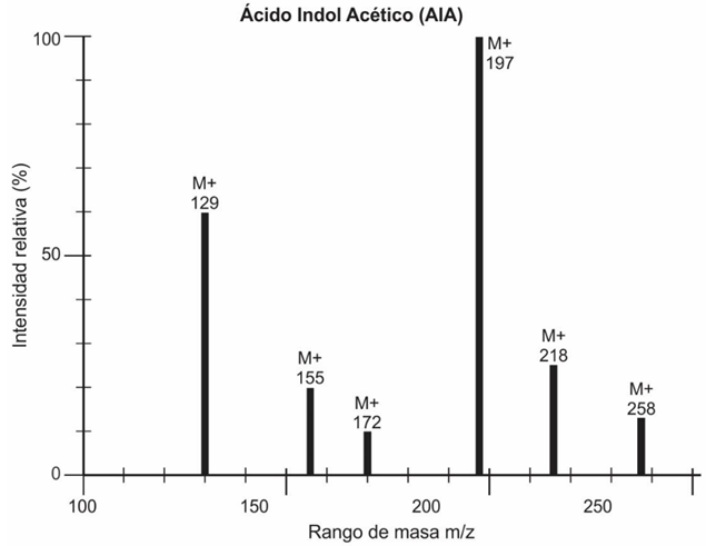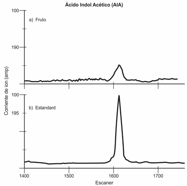 La presencia de la auxina ácido indol acético (AIA) fue detectada en el tejido del fruto de frambuesa en desarrollo. Esta hormona fue primeramente identificada a través del escaneo al ser comparada con la referencia del isótopo [13C6] AIA (Figura 1) y posteriormente en la cromatografía de gases y espectrometría de masas refiriendo su espectro de masas con el estándar de la auxina señalada (Figura 2). La molécula del ácido indol acético mostró un máximo de 197 de rango de masa y una intensidad relativa del 100%.