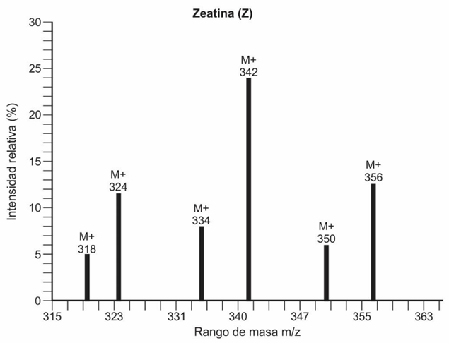 Se identificó la citocinina endógena zeatina (Z), en espectro de masas de la Figura 3. La presencia de esta hormona fue evidente al comparar su espectro de masas con el estándar correspondiente durante el proceso de análisis con la cromatografía de gases y espectrometría de masas. La molécula de zeatina mostró un máximo de 342 de rango de masa y una intensidad relativa del 24%.
