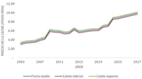 Para realizar el análisis económico del precio de la leche fluida de vaca del periodo 2023-2027 en México, se utilizó como unidad de estudio al país en su conjunto y como unidad de medida el precio promedio de mercado del periodo 2003 a 2021. La fuente de información de los precios fue SIACON-NR (2022). Las pruebas estadísticas, estimación del modelo y pronósticos se realizaron con el software Simetar© desarrollado por la Universidad de Texas A & M. Para la estimación del precio de la leche se utilizó un método estadístico univariado de series de tiempo, con 1 año de retraso utilizado el método Box-Jenkins (Waiswa 2023, Agustriyanto et al., 2023). Se utilizó como factor de riesgo la distribución de probabilidad y con ello se determinaron los mínimos y máximos del precio de la leche