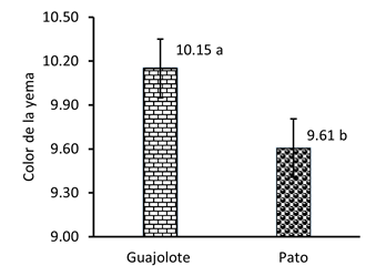 El color de la yema es una característica interna importante para el consumidor, en el huevo de guajolote criollo la yema fue más (P < 0.05) colorida que la de pato (Figura 1).