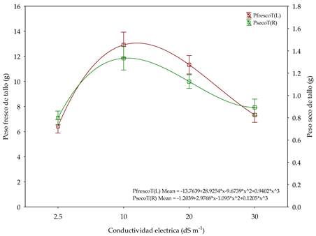 Los análisis de varianza mostraron que, la mayoría de las variables morfométricas presentaron diferencias significativas en la interacción de los factores, ecotipos × conductividad eléctrica, excepto las variables peso fresco y seco de hojas, área foliar y longitud de masa radicular (Tabla 3). La longitud de tallo, el peso fresco y seco de tallo mostraron valores mayores en las plantas del ecotipo E2 con 10 dS m-1. El ecotipo E3 con 30 dS m-1 mostró la longitud de tallo menor, mientras que, el ecotipo E1 en 2.5 dS m-1 mostró los valores inferiores de peso fresco y seco de tallo, peso fresco y seco de hojas. Si bien el peso fresco y seco de hojas no mostraron diferencias significativas, el ecotipo E3 en 20 dS m-1 mostró mayor peso fresco de hoja y el mayor peso seco de hoja lo presentaron las plantas del ecotipo E2 en 20 dS m-1. Los ecotipos E3 en 20 dS m-1 y E1 en 30 dS m-1 presentaron mayor y menor área foliar, respectivamente. Las plantas del ecotipo E3 en 20 dS m-1 mostraron los valores superiores de longitud de raíces y peso fresco de raíces; lo contrario lo presentó el ecotipo E1 en 30 dS m-1. Las plantas del ecotipo E3 en 2.5 dS m-1 presentaron los valores superiores de longitud de masa radicular; lo contrario lo mostró el ecotipo E1 en 30 dS m-1. Las plantas del ecotipo E2 mostraron mayor peso fresco de raíces, mientras que, el ecotipo E1 en 30 dS m-1, mostró los valores menores. Las variables morfométricas mostraron un desarrollo siguiendo una respuesta tipo polinomio, observándose que, en las concentraciones de 2.5 y en 30 dS m-1 de conductividad eléctrica, los valores de la mayoría de las variables disminuyeron y, en valores intermedios de conductividad eléctrica, las variables presentaron valores superiores (Figura 1). La Figura 1 muestra que, el peso fresco y seco de tallo, incrementaron conforme aumentó la conductividad eléctrica; sin embargo, en conductividades eléctricas a partir de 20 dS m-1, el peso fresco y seco de tallo disminuyeron. Esta respuesta la presentaron la mayoría de las variables morfométricas. Al incrementar los niveles de conductividad eléctrica, las variables morfométricas presentaron valores superiores en 10 y 20 dS m-1. El ecotipo E1 cuya semilla se colectó en el Colegio de Postgraduados, Montecillo, Texcoco, Estado de México, mostró los valores inferiores en la mayoría de las variables morfométricas, mientras que, el ecotipo E2 cuya semilla se colectó en el Cráter La Alberca, Valle de Santiago, Guanajuato, que es el sitio de mayor conductividad eléctrica en el suelo, presentó valores superiores en cinco variables morfométricas, al igual que el ecotipo E3, cuyo sitio de colecta de semilla corresponde al Lago Cuitzeo, Cuitzeo del Porvenir, Michoacán, con la conductividad eléctrica menor del suelo en dicho sitio de colecta. El ecotipo E3 también presentó valores superiores en cinco variables, solo que éste último, se caracterizó por exhibir valores superiores en longitud de raíces y longitud de masa radicular (Tabla 3).