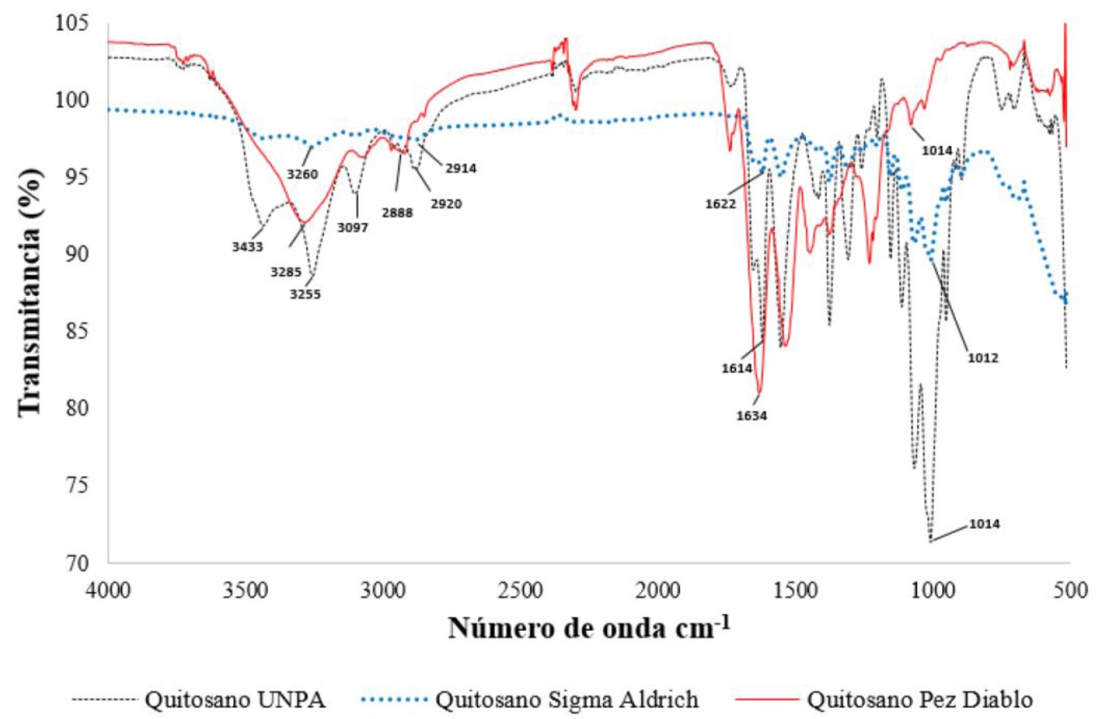 El estudio por espectroscopia infrarroja con transformada de Fourier (FT-IR) fue realizado en muestras quitinosas que provenían de las placas dérmicas del pez diablo (Hypostomus plecostomus) y desechos de camarón obtenidas por un tratamiento de hidrólisis química (Figura 1). En este estudio pueden distinguirse las señales típicas del infrarrojo del quitosano-UNPA (camarón), quitosano pez diablo comparados con un blanco comercial quitosano (Sigma-Aldrich México). Se observan bandas de absorción entre 3433 y 3255 cm-1 correspondientes al estiramiento O-H.