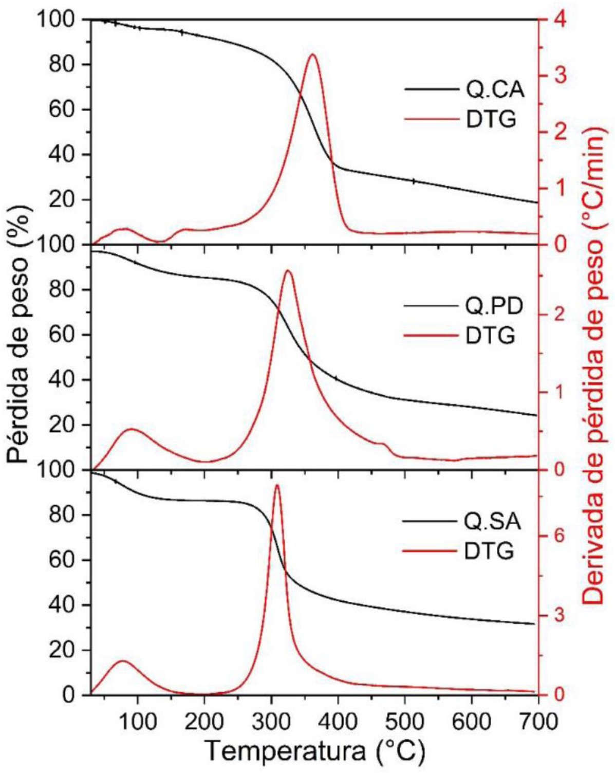 La Figura 2 muestra el análisis termogravimétrico (TGA) y térmico diferencial (DTG) del quitosano de camarón (Q.CA), pez diablo (Q.PD) y Sigma-Aldrich (Q.SA), revelando dos etapas de degradación térmica. La primera etapa, entre 50 y 100 °C, que corresponde a la eliminación de agua superficial con una pérdida de peso cercana al 10% en todas las muestras, característico de materiales higroscópicos como el quitosano. La segunda etapa, entre 220 y 410 °C, se atribuye a la degradación de las cadenas poliméricas mediante desacetilación y ruptura de enlaces glicosídicos, con una pérdida de peso aproximada del 60%. El quitosano de camarón mostró mayor estabilidad térmica, desplazando su segunda etapa de degradación a temperaturas más altas, lo que sugiere una mayor cristalinidad o grado de desacetilación. En contraste, el quitosano del pez diablo presentó una degradación a temperaturas más bajas, indicando menor estabilidad térmica posiblemente por impurezas o un menor grado de desacetilación. El quitosano Sigma-Aldrich mostró un perfil de degradación más definido, reflejando una estructura más homogénea y mayor pureza. El análisis DTG indicó picos más agudos en Q.SA en comparación con Q.CA y Q.PD, lo que reafirma su mayor pureza. Estos resultados destacan las diferencias estructurales y térmicas entre los quitosanos analizados.