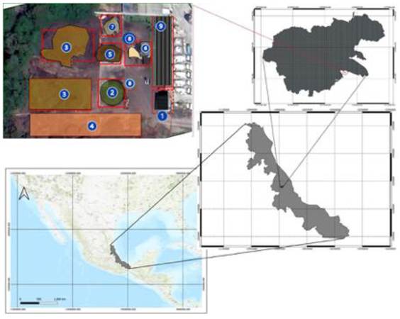 Figure 1 Geographic location and spatial distribution of the functional areas within the municipal composting center of the city of Xalapa, Veracruz. The top-left panel shows a satellite image of the facility, with numbered blue circles (1-9) indicating key operational zones: 1. Security booth and stockroom; 2. OSW arrival area; 3. Composting piles in the initial phase; 4. Storage area of organic waste from parks and gardens; 5. Composting pile in the final phase; 6. Sieving area; 7. Storage of sieved compost; 8. Leachate storage tank; and 9. Vermicomposting beds.