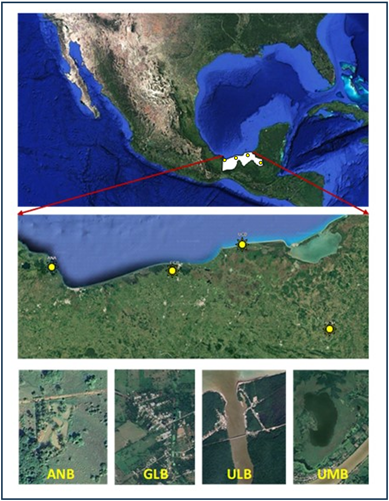 Figure 1 Geographic location of collection sites for M. urophthalmus broodstock. Geographic coordinates are: ANB (18°15'53"N 94°38'18.0"W); GLB (18°19'44"N 93°16'41"W); ULB (18°38'27.5"N 92°27'32.5"W); UMB (17°33'40"N 91°24'06"W).