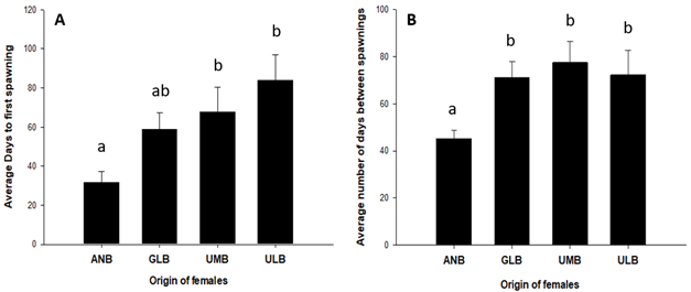 M. urophthalmus reproduction under captive conditions occurs from March to September. However, only fish from the ANB locality reproduced from March onwards, without spawning for the other localities this month. From April onwards, spawning was obtained for fish from all localities. Towards the end of the spawning season, spawning was only obtained in fish from ANB and ULB during September. These results indicate that ANB females had the longest season, extending two months. The factorial ANCOVA, including female origin, male origin, and the covariate female weight as factors, indicates that ANB females had their first spawning in the shortest time (p < 0.01) as they required a mean (± SD) of 31.45 (± 19.52) days for first spawning; In contrast, GLB, UMB and ULB females required means of 58.60 (± 27.87), 67.70 (± 47.50) and 83.71 (± 34.01), respectively (Figure 2). The average number of days between spawning is highly significant only for female origin (ANCOVA; p < 0.001). This was lower for females from ANB, while the other three basins were not significantly different (Figure 2).
