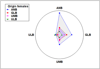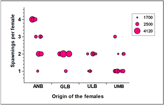 The affinity between females and males is reflected in the number of spawnings per cross. Two females of the ANB-ANB cross spawned up to five times, and two more spawned four times. Another highly productive cross was the ANB-GLB cross, as one female spawned four times, and two more spawned three times each. Two more ANB females had three spawnings, along with UMB-ULB males, and only one UMB female had three spawnings in the season. Seventeen females were recorded with two spawnings throughout the season: eight from GLB, four from ULB, three from UMB, and two from ANB. Twelve females had only one spawning throughout the study, six of them from UMB, three from ULB, two from GLB, and one from ANB (Figure 5). The size of the polygons in the figure clearly shows the reproductive capacity of females from each locality, as well as the affinity with males.
