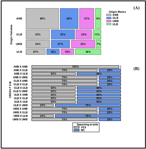 Figure 4 Mosaic plot for percentage spawning values as a function of origin for females (rows) and males (columns) (A). Mosaic plot for the percentage of spawned and non-spawned females per cross (B).