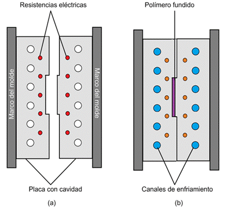 Un control dinámico de la temperatura del molde se implementa calentando y enfriando el molde en cada ciclo del proceso, por lo que la transferencia de calor es muy diferente de la del proceso MIC. En la etapa de calentamiento del molde, este debe ser calentado hasta la temperatura preestablecida utilizando resistencias eléctricas, Wang en [20], propone que, para mejor apariencia de la pieza de plástico, la temperatura en la superficie de la cavidad del molde debe ser igual la temperatura de cristalización del polímero en la etapa del llenado. El calor generado se transfiere principalmente al acero del molde a través de la conducción del calor, solamente una pequeña cantidad de calor se acumula en las resistencias eléctricas y en el marco del molde y otra se disipa al ambiente.