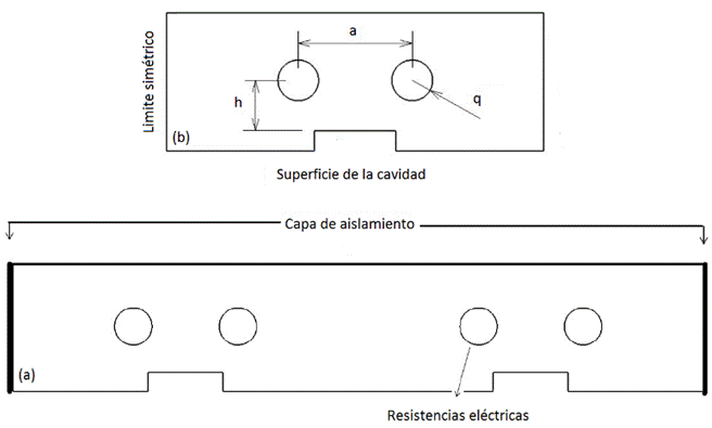 El análisis térmico transitorio y el análisis térmico-estructural se implementaron con base al software comercial ANSYS para analizar la respuesta térmica y la resistencia estructural del MRTR. Para MRTR, el sistema de calentamiento por resistencias eléctricas se puede utilizar para un calentamiento uniforme y eficiente, para partes de forma simples y complejas. La Figura 3(a) muestra la geometría total del inserto de la cavidad que será calentado, en la Figura 3(b), se observa la simplificación de la geometría para la simulación térmica-estructural, esta simplificación es el resultado de la parte central de la probeta de tensión (cuello de la probeta), que es donde se concentra los esfuerzos y la falla mecánica. En esta ilustración a, h, y q representan la distancia de centro a centro de las resistencias, la altura del centro de la resistencia a la superficie de la cavidad y el flujo de calor por unidad de área, respectivamente.