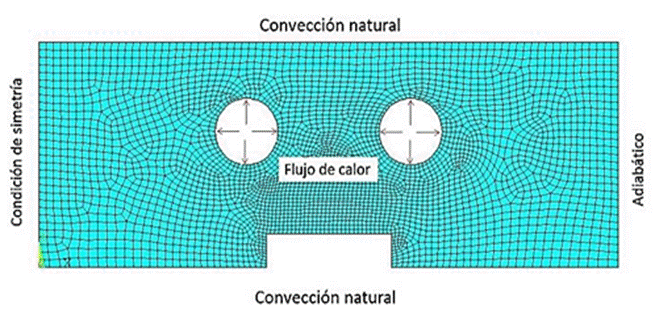 El modelo de malla y las condiciones de frontera en el análisis transitorio de transferencia de calor se muestran en la Figura 4. Se considera la temperatura inicial del molde de 30 0C, equivalente a la temperatura del aire ambiente en el laboratorio. La condición de convección de aire libre se cargó en la superficie externa del molde y el coeficiente de transferencia de calor por convección correspondiente fue de 20 W/m2[25]. Para la parte lateral izquierda se implementó una condición de simetría que permite reducir el modelo de malla, y del lateral derecho se aplicó un flujo de calor cero por defecto debido a la capa de aislamiento. El medio para calentar el inserto del molde son las resistencias eléctricas.