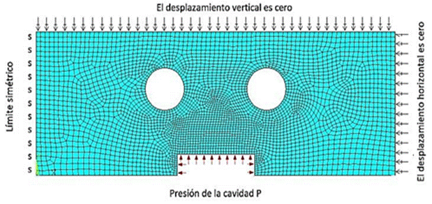 En esta ilustración, P representa la presión de inyección, que se supone es de 80 MPa. En el límite izquierdo del modelo, la condición de simetría es implementada, en el límite derecho, el desplazamiento en la dirección normal es cero. Dado que los insertos de molde son soportados por la placa de retención para la fijación, el desplazamiento en el borde superior del modelo es también cero en la dirección vertical.