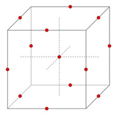 Para el diseño experimental, se seleccionó el método DBB porque ofrece un equilibrio razonable entre precisión de predicción y economía de ejecución. Requiere tres niveles de cada factor y es siempre de forma esférica. El tratamiento experimental para DBB en tres factores se muestra esquemáticamente en la Figura 6, en el bloque o cubo, un cierto número de puntos de diseño se colocan en los puntos medios de los bordes, mientras que los otros se mantienen en el centro del bloque.