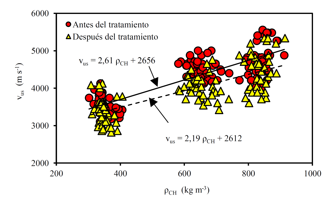 Las densidades predicen las velocidades de onda con coeficientes de determinación R2 entre 0,69, para antes del tratamiento y 0,55 para después del tratamiento (Figura 2).