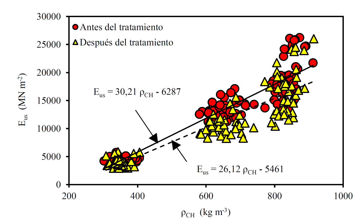 Para maderas mexicanas, [11] reportan que en madera de Spathodea campanulata la densidad disminuye 6 % pero el módulo de elasticidad aumenta 8 %. En cambio, en Guazuma ulmifolia observan aumentos en la densidad de 3 % y en el módulo de elasticidad de 4 %. En el mismo sentido, reportan que en Abies religiosa la densidad se incrementa 4 % pero el módulo de elasticidad disminuye 7 %.