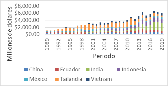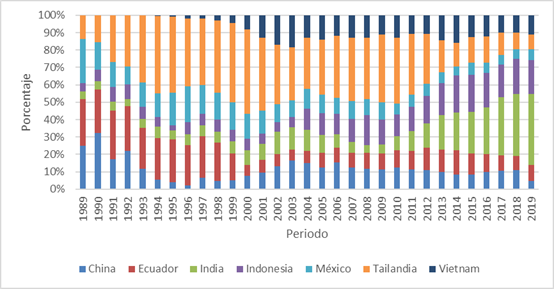 Como se menciona en apartados anteriores, los principales países que componen al mercado interno son: China, Ecuador, México, India, Indonesia, Tailandia y Vietnam. Siendo congruentes con esto se analizaron los datos de estos países para el periodo propuesto 1989-2019.