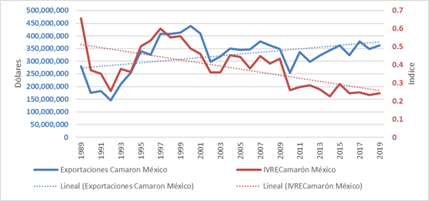 Figura 3 Exportaciones de camarón de México e índice de ventaja revelada de exportación (dólares de EE.UU).