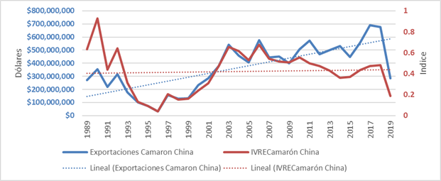 Figura 4 Exportaciones de camarón de China e índice de ventaja revelada de exportación.