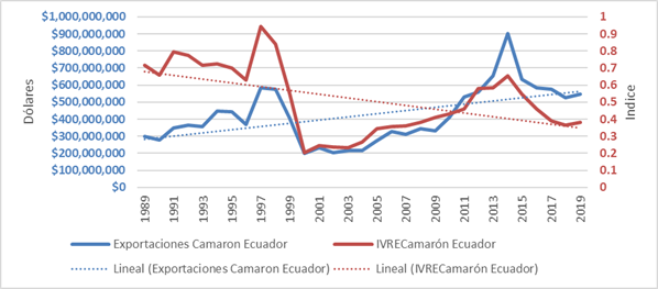 Figura 5 Exportaciones de camarón de Ecuador e índice de ventaja revelada de exportación (dólares de EE.UU.).