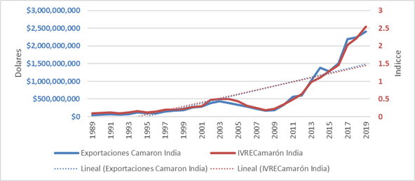 Figura 6 Exportaciones de camarón de India e índice de ventaja revelada de exportación (Dólares de EE.UU.).