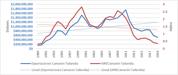 Figura 7 Exportaciones de camarón de Tailandia e índice de ventaja revelada de exportación (dólares de EE.UU.).