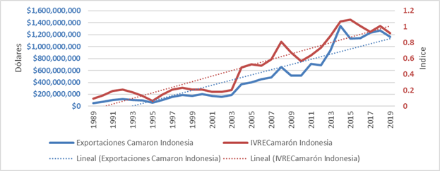 Figura 8 Exportaciones de camarón de Indonesia e índice de ventaja revelada de Exportación (dólares de EE.UU.).