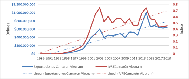 Figura 9 Exportaciones de camarón de Vietnam e índice de ventaja revelada de exportación (dólares de EE.UU.).