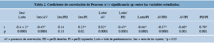 La tabla 2 presenta los datos de la prueba de Pearson, con correlación buena para el análisis de lado de predominancia versus anteversión y correlación pobre para el perfil derecho versus izquierdo, con todos los otros resultados presentándose débiles o sin significancia (p > 0.05).