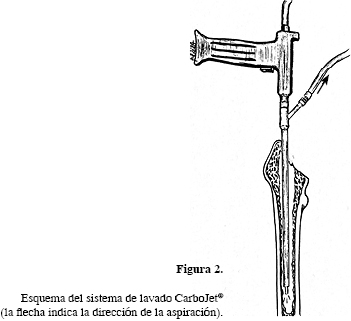El sistema de lavado CarboJet® consiste en un chorro de CO2 comprimido, combinado con un sistema de succión que es una alternativa al clásico sistema de lavado pulsátil con suero salino, con la ventaja teórica de enviar menor cantidad de émbolos a la circulación durante el procedimiento de la cementación, dado que la sangre y los restos de grasa serían eliminados de forma agresiva del canal femoral. Curiosamente, algunos autores han comunicado que su uso podría prevenir la embolia gaseosa en la cirugía de cadera.6 Sin embargo, por su mecanismo de acción puede ser considerado una fuente de émbolos de gas de alta velocidad en el interior del canal. En nuestro caso, la arritmia y el posterior paro cardiorrespiratorio ocurrieron inmediatamente tras el empleo del CarboJet®, por lo que parece claro que hay una relación causa-efecto. Por tanto, una vez descartadas otras complicaciones más importantes, finalmente la causa del paro cardiorrespiratorio se atribuyó a un mecanismo de embolia gaseosa. La embolia gaseosa es una complicación quirúrgica muy poco frecuente que consiste en la entrada de aire hacia la circulación sanguínea, generalmente a través de los vasos venosos. Ésta es más frecuente en neurocirugía y cirugía cardíaca y raramente se produce en cirugía ortopédica. En la patogenia del embolismo gaseoso, los factores más importantes son la velocidad de penetración del gas y aquellos factores que evitan el colapso venoso. Una vez que el aire ha alcanzado la circulación venosa, llega a las cavidades derechas del corazón a través del sistema cava y los émbolos son conducidos hacia las arterias pulmonares provocando disfunción pulmonar. Sin embargo, puede haber problemas no pulmonares. La circulación pulmonar puede ser saltada por un foramen oval permeable o por shunts intrapulmonares. Un embolismo coronario puede producir arritmia cardíaca o paro cardiorrespiratorio, debido a la inestabilidad eléctrica o shock cardiogénico como consecuencia de infarto de miocardio extenso.14 La incidencia real es difícil de determinar, ya que depende de la sensibilidad de los métodos de detección, además de que la mayoría de éstos son subclínicos.15