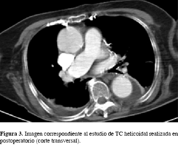 La paciente fue trasladada a la Unidad de Cuidados Intensivos (UCI) con ventilación mecánica, manteniéndose hemodinámicamente estable. No se detectó incremento de enzimas cardíacas (estudio seriado) ni alteraciones analíticas tras la complicación intraoperatoria, por lo que el diagnóstico fue embolismo gaseoso durante el tiempo de lavado femoral con el sistema CarboJet®. La paciente permaneció 24 horas en la UCI, posteriormente se trasladó a la planta de traumatología y fue evaluada de nuevo por el Departamento de Anestesiología. Se realizó TC helicoidal toracoabdominal con contraste, con hallazgos de moderado derrame pleural bilateral, atelectasias basales y múltiples fracturas costales anteriores (como consecuencia de la resucitación cardiopulmonar) (Figura 3). El ecocardiograma mostró la cardiomiopatía hipertensiva inicial, insuficiencia valvular aórtica y tricuspídea, pero con una fracción de eyección normal. La paciente no tuvo ninguna secuela tras el evento, por lo que, aunque presentó alto riesgo, se realizó un segundo tiempo quirúrgico transcurridos ocho días desde la primera cirugía y se le implantó la hemiartroplastía cementada mediante vástago cementado y cúpula bipolar (Figura 4). En este caso no se produjeron complicaciones intraoperatorias y la paciente se recuperó y comenzó a caminar con un andador cuatro días tras la intervención. Finalmente fue dada de alta seis días después.