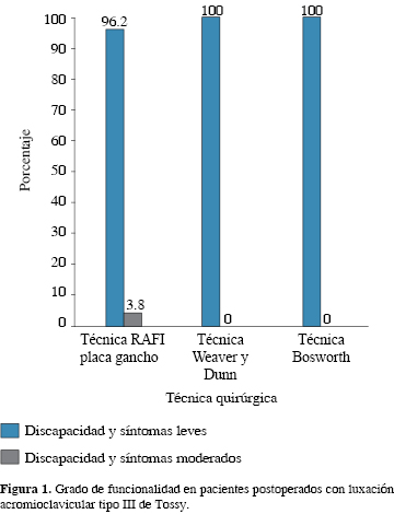 La técnica de Weaver-Dunn presenta una baja aceptabilidad como técnica aislada y debe asociarse a otras técnicas como la fijación acromioclavicular o coracoclavicular.12 Sin embargo, no se observó ninguna diferencia funcional en nuestro estudio, se operaron 11 pacientes (26%) con esta técnica, también mostrando un rango de discapacidad leve y síntomas leves según el cuestionario de DASH.